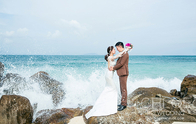 礁石上是最好的栖息地了,摄影师算好时间海浪翻腾的一瞬间,新人拥抱,脸对脸,幸福感就表现的很强烈了。新娘这个时候就比较推崇选择白色鱼尾群,在海边白的礼服会衬拖新娘的肤色很好,新娘稍微侧下角度,身材就会显得凹凸有致了。