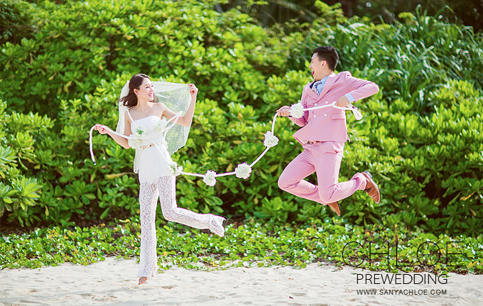 蜈支洲的海除了沙滩还有背后的一块绿,让你的海边婚纱照不再单调,转换角度切个背景,在沙滩上借助道具疯狂跳跃也是一个不错的姿势,在单调的沙滩,适用于任何有创意的道具,也给了一个不会摆姿势的新人一些借助工具。
